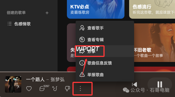 第1步. 首先打开 汽水音乐 软件,然后找到并播放需要下载的音乐,再点击左边的 三个点(更多功能),选择分享,这时候会提示 已复制分享链接。