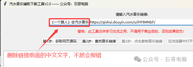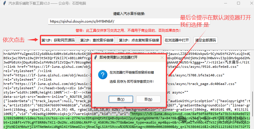 第2步. 打开 汽水音乐辅助下载工具,在 输入汽水音乐链接 文本框使用 Ctrl+V 粘贴刚才复制的地址,记得把链接前面的中文文字删除掉,再依次点 1.获取网页源码-2.查找音乐链接-3.点击复制音乐链接(这时候会提示使用默认浏览器打开链接,我们选择 是 )